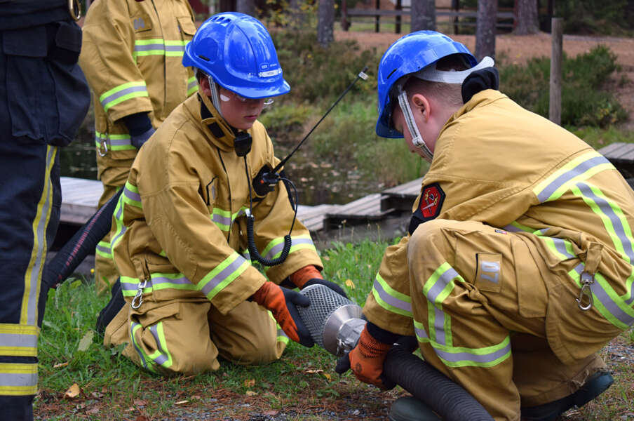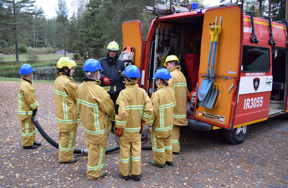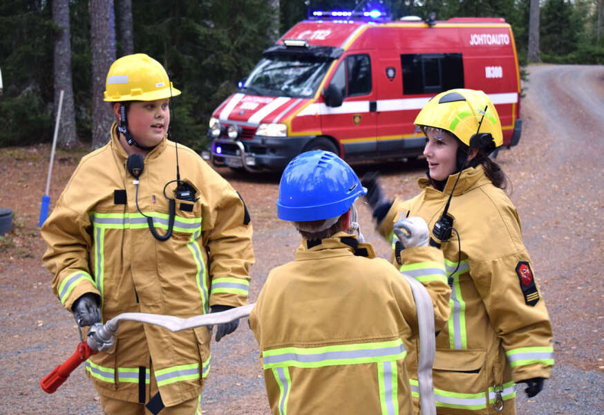 Maastopaloharjoituksessa Kosken Eränkävijöiden metsästysmajalla oli syttynyt maastopalo, joka piti sammuttaa luonnonvedellä. Nuorimpien osallistujien pelastajaryhmä saapui paikalle ja ryhmän vetäjä Salli Peltola, 13, kuunteli tilannetiedotuksen Kytölältä. Sitten alkoi tapahtua. Jokivarren VPK:n Markus Kyläniemi ohjeisti ryhmäänsä ja tiimi kantoi lammen rantaan moottoriruiskun, sihtiletkun ja sammutusletkun. Känkänen kaasutti tekopalon liekkiä isommaksi ja pelastajatiimi sammutti palon sekä sen etäpesäkkeet mallikkaasti. Pumpun kanssa toimiminen oli selvästi uutta ja kaikki saivat arvokasta oppia liitännöistä sekä oikeanlaisista käsimerkeistä, joilla kommunikoitiin tilanteessa välimatkan päästä.